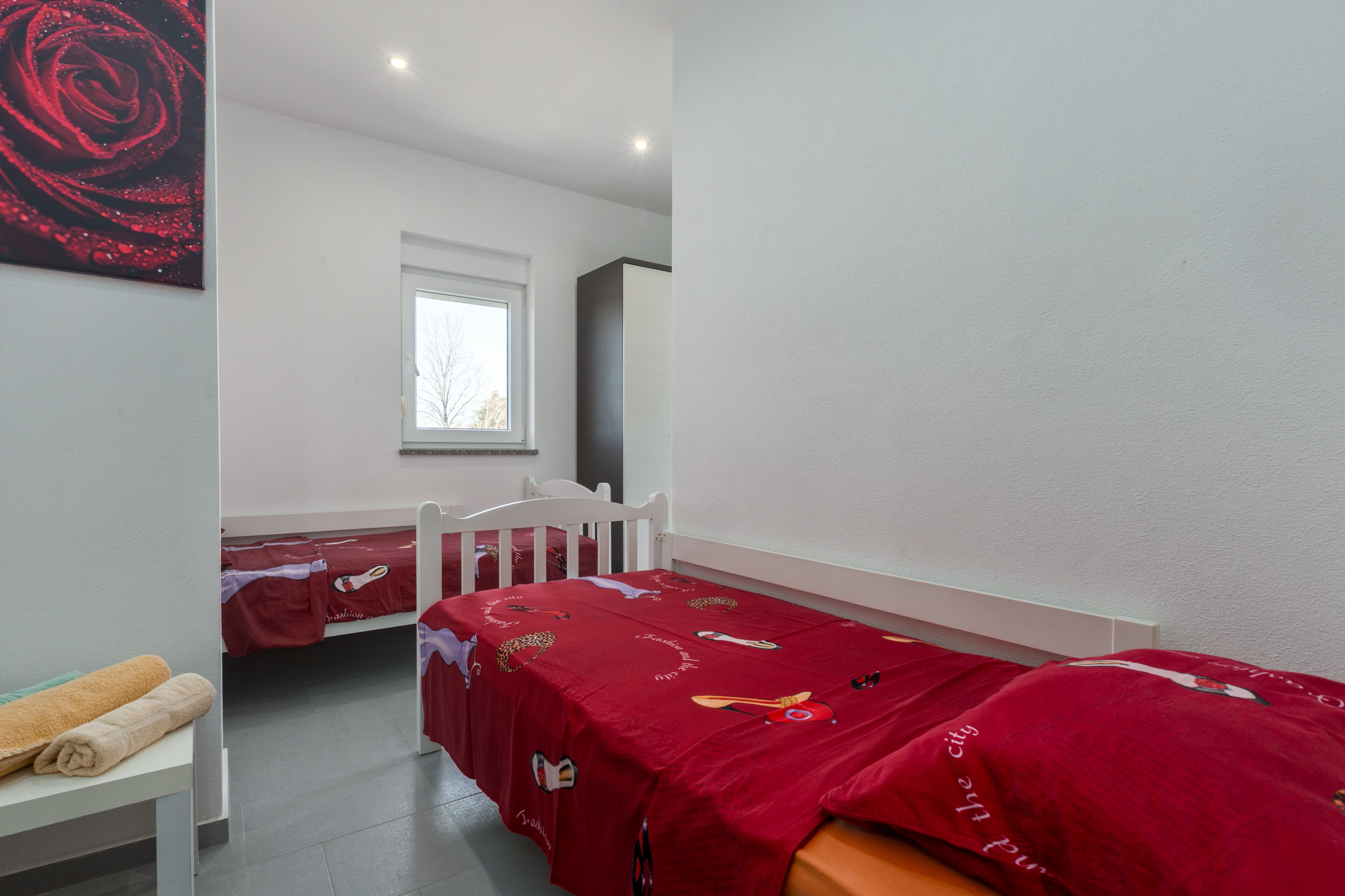 double bed and with balcony, third bedroom has two single beds and balcony. Apartment also